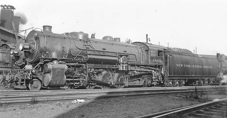 Pittsburgh, McKeesport & Youghiogheny 2-8-2 No. 9558 of class H-8b appears at McKee's Rocks, Pennsylvania on October 25, 1936 in a photo by Howard Davis. The H-8s all had 57-inch drivers, 26½x30-inch cylinders, and a steam pressure of 190 p.s.i. This class had a locomotive weight of 332,700 pounds and produced 59,690 pounds of tractive effort, to which a booster added 10,300 pounds. Their grate area was 60 square feet, with 4740 square feet of evaporative heating surface and 1085 square feet of superheating surface. ALCo built all the H-8s between 1916 and 1920, with No. 9558's group being delivered in 1917. Some members of class H-8b saw further service in Mexico after 1945; No. 9558, however, was part of a group transferred to the Monongahela Railway in 1948, where she became No. 199.