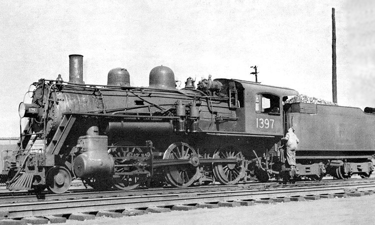 At one time the Boston & Maine owned 140 2-6-0 (Mogul type) locomotives of class B-15, some of which survived to the end of steam on the B&M in Boston suburban service. No. 1397 of class B-15b is shown here at Boston on June 7, 1939 in a postcard view attributed to David Holway. She belonged to the first group of this class, delivered by the Manchester Locomotive Works between 1903 and 1906. Although originally equipped with slide valves, beginning around 1920 many were later retrofitted with piston valves (retaining the squared steam chest) which allowed them also to be superheated. They had 19x26-inch cylinders, a boiler pressure of 200 p.s.i., and a driving wheel diameter of 63 inches. For other dimensions, consult the page for No. 1425 following.