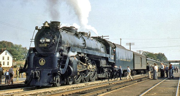 B&O Pacific No. 5315 pauses with a railfan trip at Aiken, Maryland, on October 11, 1953 in this color view by A. C. Zempe from the Burd collection, contributed by Frank Fabian. This locomotive, like all the P-7s, was originally named for a U. S. President — in this case the fifteenth President, Andrew Johnson. No. 5315 displays the characteristics of the extensive rebuilding applied to some of the "President" Pacifics after World War II, being reclassified as P-7e after rebuilding. For information on the rebuilding program see the previous page for No. 5314. Despite the 1949 modernization seen here, No. 5315 was retired a year before the 1957 renumbering of all B&O steam locomotives. Dimensions of the class are given on the page for No. 5304.