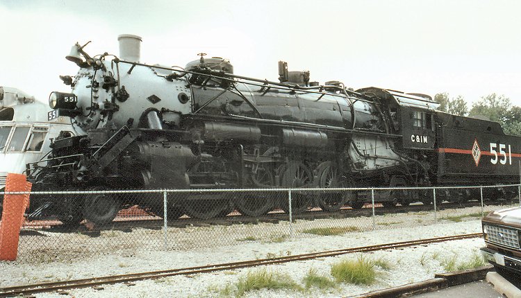 The only surviving steam locomotive of the Chicago & Illinois Midland is No. 551, one of three 2-8-2s of class F-4 delivered by Lima Locomotive Works in 1928. They had cylinder dimensions of 26x30 inches, a boiler pressure of 200 p.s.i., and 63-inch drivers. They produced 54,700 pounds of tractive force and weighed 138 tons. They had a grate area of 67 square feet and an evaporative heating service of 3502 square feet. Today No. 551 is at the National Museum of Transportation in suburban St. Louis, where I took this photo on July 12, 1990.
