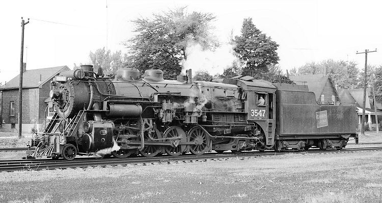 Canadian National No. 3547 prepares to couple to its outbound train at Stratford, Ontario, on September 5, 1958. This 2-8-2 of class S-2-a was a 1923 product of Montreal Locomotive Works. With 63-inch drivers, she sustained a boiler pressure of 185 p.s.i. and had 25x30-inch cylinders. Weighing 314,800 pounds, she produced 54,590 pounds of tractive force. The S-2 class had 63 inches of grate area, 3550 square feet of evaporative heating surface, and 885 square feet of superheating surface. This is another of the many views my brother snapped on his 1958 expedition into Canada.