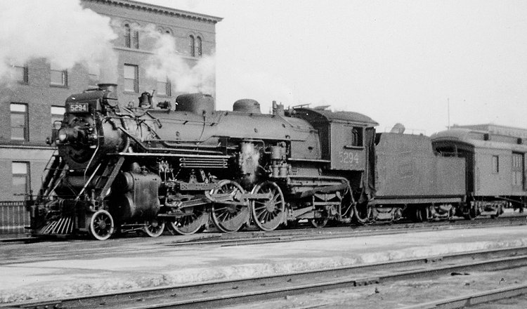 Douglas Kerr provided this photo of CNR J-7-b Pacific No. 5294, which his father Ken Kerr took at London, Ontario, in 1939. The locomotive was delivered in 1919 by Montreal Locomotive Works as Canadian Government Railway No. 522 and was then acquired by the Canadian National, which leased it to the Grand Trunk Railway as No. 1522 before absorbing it into the CNR numbering sequence. The engine lasted until being torched in 1961. The dimensions of this class were similar to those of the the J-7-c class, shown for Nos. 5295 and 5299, but their locomotive weight was 268,000 pounds. Mr. Kerr also took a closeup shot of No. 5294's cylinders and running gear.