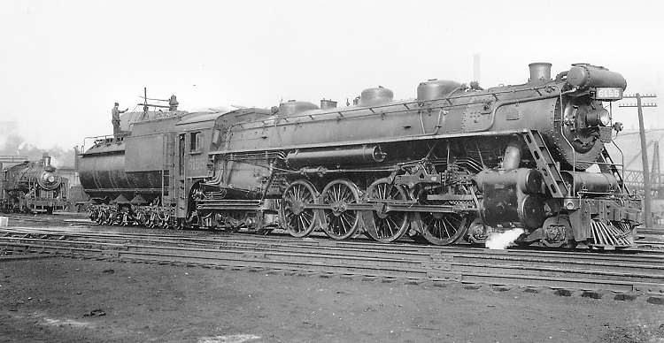 Canadian National 4-8-4 No. 6155 takes on water, in a photo of unknown origin and location. The dual-service U-2-c class developed 56,785 pounds of tractive effort and weighed 383,000 pounds. They had 25½x30-inch cylinders, 73-inch drivers, and 250 p.s.i. of boiler pressure. Their grate area measured 84 square feet; with 4220 square feet of evaporative heating surface, they had a superheating surface of 1760 square feet.