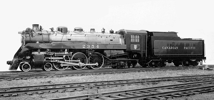 Canadian Locomotive Company of Kingston, Ontario, outshopped 4-6-2 No. 2354 in 1942 as part of the Canadian Pacific's order for class G3e. These semi-streamlined Pacifics were a modernization of an older, tried-and-true design. They had 22x30-inch cylinders, a boiler pressure of 275 p.s.i., and a driving wheel diameter of 75 inches. Weighing 321,000 pounds, they developed a tractive force of 45,254 pounds. Evaporative heating surface totaled 3497 square feet, superheating surface 1473 square feet, and grate area 65 square feet. Originally a coal burner, between 1952 and 1956 this engine was listed as an oil burner and was scrapped in Calgary, Alberta in 1960. This Canadian Pacific publicity photo from the collection of Kenneth Levi Giffin was contributed by his son Noel.