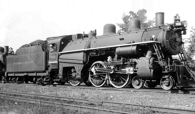 Eventually the various members of the class came to differ considerably in specifications, with boiler pressure ranging from 200 to 225 p.s.i. and tractive effort from 30,150 to 34,000 pounds. Driver diameter is given as 72 inches, and No. 506 weighed 204,800 pounds and had 22x26-inch cylinders. When superheated, she had 1897 square feet of evaporative heating surface and 375 square feet of superheating surface. The Wooten firebox, with its 85 square feet of grate area, was designed for cooler-burning anthracite instead of bituminous coal; its width was what prompted these engines' original construction as camelbacks. Later, that width made it possible for the D&H's Colonie Shops to install the railroad's distinctive outboard ash pans, which partially hide the third set of driving wheels. The last surviving members of the D-3 class were withdrawn from service in 1952.