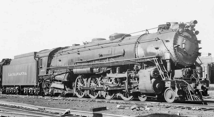 The Delaware, Lackawanna & Western styled its 4-8-4s the "Pocono" type instead of the usual "Northern" label. Unlike the Lackawanna's first group of passenger 4-8-4s, the Q-1 class, the second group in class Q-2 came from American Locomotive Company in 1929 with 70-inch drivers suitable for freight service. They sustained a boiler pressure of 230 p.s.i. and had 28x32-inch cylinders. For other dimensions see the commentary for No. 1614, following. Some of the Q-1s, including this example, had a Worthington type SA feedwater heater mounted in the smokebox, requiring it to be extended forward and the headlight to be mounted high. An unidentified lensman captured this view of No. 1604, acquired via eBay, in 1948 at Scranton, Pennsylvania.