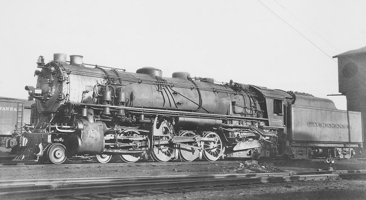 The DL&W's class P-5 Mountain types were built in 1927 by American Locomotive Company as three-cylinder compound engines, and retained that configuration until retirement of the last member of the class in 1950. Their driver diameter was 63 inches, like that of most 2-8-2s, and like most Mikados their main rod connected to the third set of drivers instead of the second as with most 4-8-2s. Their outside, high-pressure cylinders had dimensions of 25x32 inches, with the inner low-pressure cylinder measuring 25x28 inches. Boiler pressure was 200 p.s.i., and they weighed 397,500 pounds and produced 77,579 pounds of tractive effort. They had 5010 square feet of evaporative heating surface, 1291 square feet of superheating surface, and a grate area of 80 square feet. No. 2228 poses at Secaucus, New Jersey in 1931 for an unidentified lensman in this image purchased from an eBay seller. The same photo appears in the Railfan.net ABPR Archive from Bud Laws.