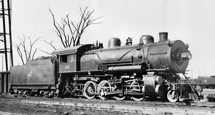 No. 114 belonged to the railroad's Class 100, a group of Consolidations delivered by ALCo's Brooks Works in 1909. They had 57-inch drivers, 22x30-inch cylinders, and a boiler pressure of 200 p.s.i. They weighed 227,560 pounds and produced 43,305 pounds of tractive effort. Their grate area measured 49½ square feet, and they had 2800 square feet of evaporative heating surface and 570 square feet of superheating surface. The Baker valve gear would have been a retrofit, since images of the Baker gear from the Pilliod Company's catalog circa 1915 do not go back before 1911. In any case all those images show the combination lever behind the crosshead, rather than between crosshead and cylinder, so No. 114's Baker gear as shown here must have been a later application.