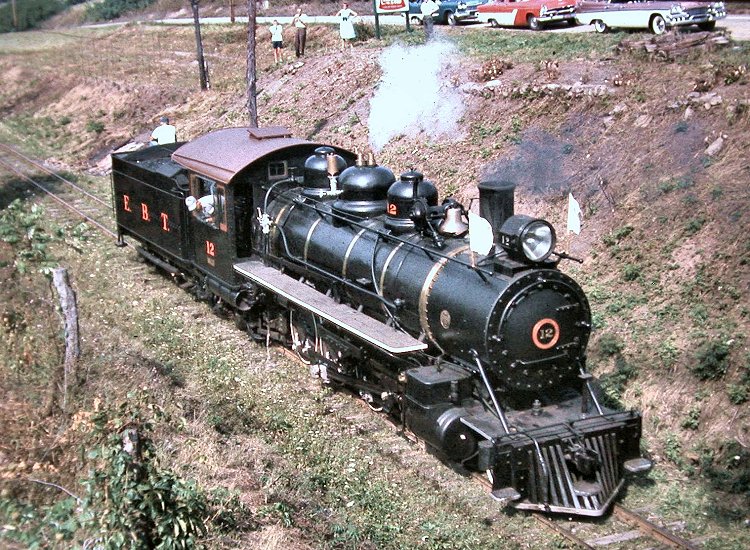 East Broad Top 3-foot gauge 2-8-2 No. 12 pauses in a cut near Orbisonia, Pennsylvania, in August 1960 during the first summer of the former coal carrier line's tourist operation. The 112,000-pound locomotive, nicknamed "Millie," was built by Baldwin in 1911. With a 180-p.s.i. boiler pressure, 48-inch drivers and cylinder dimensions of 17x24 inches, she developed a tractive force of 22,100 pounds. I took the transparency during a family vacation trip bringing me from Illinois to attend theological school in Boston; our red and white 1955 Plymouth is among the vehicles parked along the parallel highway. The East Broad Top was designated a National Historic Landmark in 1954 and operated as a tourist attraction for many years, but its facilities and rolling stock are currently displayed as a museum of American industrial history.