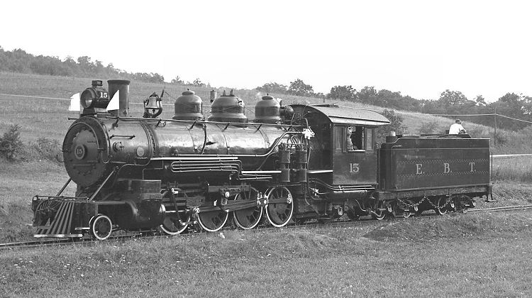 My brother, David Leonard, snapped East Broad Top's narrow gauge (36-inch) Mikado No. 15 as she staged a photo runby in August 1960, near Orbisonia, Pennsylvania. A 1914 product of Baldwin Locomotive Works, No. 15 was the mainstay of the East Broad Top tourist operation, appearing in several YouTube videos. With 48-inch drivers and 19x24-inch cylinders, the 2-8-2 sustained 180 p.s.i. of boiler pressure. She weighs a total of 150,150 pounds and developed 27,600 pounds of tractive effort.
