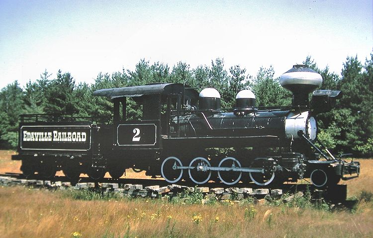 This three-foot gauge Consolidation never ran on Edaville's two-foot gauge trackage, but was displayed near the theme park entrance at Middleboro, Massachusetts when I took this transparency in July 1965. The H. K. Porter Company built the engine in 1909 for the Argent Lumber Company as its No. 4; it spent most of its career near Hardeeville, South Carolina and was retired in 1959. After being on static display at Edaville it was acquired by a private owner and subsequently sold to the Connecticut Antique Machinery Association in Kent, Connecticut, where it is displayed with its original number restored. No details are available regarding its specifications.