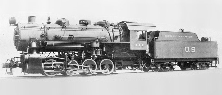Baldwin Locomotive Works delivered 0-8-0 switcher No. 333 to the Elgin, Joliet & Eastern in 1919, as a member of the AS-4 class built to USRA specifications. These engines had 25x28-inch cylinders and a driving wheel diameter of 51 inches, and sustained a boiler pressure of 175 p.s.i. They weighed 214,120 pounds and mustered 51,041 pounds of tractive effort. With 2775 square feet of evaporative heating surface and 615 square feet of superheater surface, they had 47 square feet of grate area. This builder's photo of No. 333, which was retired in 1949, appeared in a spare parts catalog issued in the 1920s by The Pilliod Company, manufacturers of the Baker locomotive valve gear.