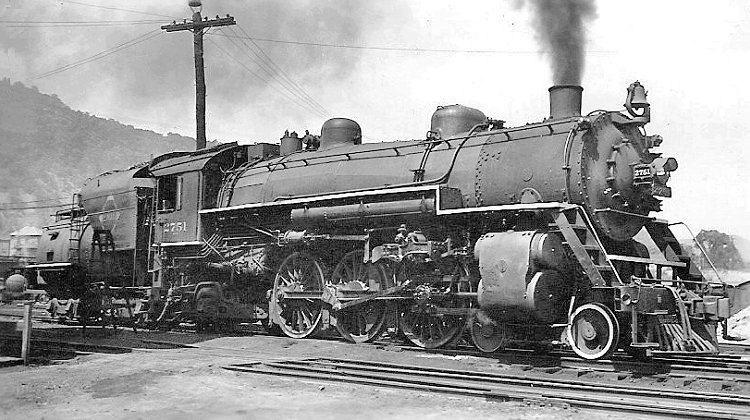 In 1923 Baldwin Locomotive Works delivered ten 4-6-2 locomotives of class K-4-A to the Erie Railroad. Because their intended use was for fast freight service, they were built with 69-inch drivers. Within a few years, however, they were fitted with 75-inch drivers and transferred to passenger service, the preponderant use for a Pacific type. As rebuilt they had 25x28-inch cylinders and a boiler pressure of 210 p.s.i. They produced 41,650 pounds of tractive effort and weighed 285,410 pounds. Their grate area measured 58 square feet, their evaporative heating surface 3671 square feet, and their superheating surface 1313 square feet. No. 2751 of the class poses for Robert Graham at Port Jervis, New York on July 24, 1933. Although the same photo appears in George Elwood's Fallen Flags site, this image was taken from a print in the Wayne Koch collection.