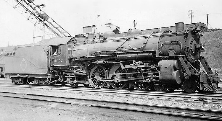 From the collection of Wayne Koch comes this photo of Erie Pacific No. 2902, erected by Lima Locomotive Works in 1913 as a member of the K-2 class. The same view from another collection appears on George Elwood's Fallen Flags site, indicating it was taken in Susquehanna, Pennsylvania, on August 20, 1936. These engines weighed 299,000 pounds and exerted a tractive force of 45,065 pounds. With 77-inch drivers, they carried 200 p.s.i. of boiler pressure and had 27x28-inch cylinders. Their evaporative heating surface totaled 3848 square feet, their superheater surface 805 square feet, and their grate area almost 67 square feet. Records indicate that all K-2s were withdrawn from service by 1947.