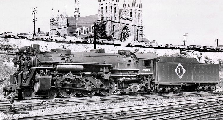 The Erie's K-5 and K-5-A classes were the only 4-6-2s built to the USRA standard heavy Pacific design, and were the railroad's premium passenger power until the introduction of diesels. The K-5-A class came from Baldwin Locomotive Works in 1923 with many of the same dimensions as the K-5 class. However, their boiler pressure was slightly higher at 210 p.s.i., yielding a greater tractive force of 46,121 pounds, and their engine weight was 323,000 pounds. Near the end of their service life they were upgraded with a multiple-bearing crosshead and disc drivers. In this view an unnamed lensman captured at Youngstown, Ohio, on May 22, 1941, No. 2939 has pulled away from its train to take on water. The image was taken from a Flickr site taken offline in 2008, and also appears in the Railfan.net ABPR Archive, having been uploaded to that massive collection by Bud Laws. For other dimensions of the K-5-A class consult the commentary on No. 2941 following.