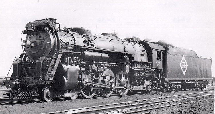The ten locomotives of the the K-5-A class were the "top of the line" in the Erie's passenger fleet, as shown in this photo of No. 2941 at Buffalo on August 7, 1943. Regarding their steam-producing capacity, they boasted 3727 square feet of direct evaporative heating surface, of which 151 square feet was provided by thermic siphons, arch tubes, and a combustion chamber. Their superheating surface is reported as 1070 square feet; for other specifications see the previous commentary for No. 2939. The image, photographer not specified, comes from a discontinued Flickr site and also appears in the Railfan.net ABPR Archive, its presence there attributed to Bud Laws. Other images on the Internet reveal that No. 2941 eventually received a full set of disc drivers, but all locomotives in the K-5-A class were stricken from the Erie roster by the end of 1952.