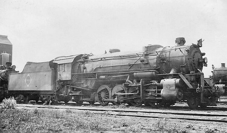 The Erie's N-2 class of Mikados were constructed by ALCo's Brooks Works in 1918 to the USRA heavy 2-8-2 design. They weighed 320,000 pounds and delivered 59,800 pounds of tractive effort. With cylinders of 27x32 inches, they featured 190 p.s.i. of boiler pressure and the usual 63-inch Mikado driver diameter. Their grate area measured 71 square feet, their evaporative heating surface totaled 4296 square feet, and their superheating surface measured 993 square feet. In this image of N-2 No. 3209 from the Wayne Koch collection the locomotive appears to be in storage with the stack covered, suggesting a time during the Great Depression of the 1930s. No information exists concerning the photographer and location.