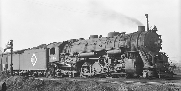 Erie Berkshire No. 3360 of class S-3 appears here at Secaucus, New Jersey in August 1948. Carl Weber provided this image by an unnamed lensman. After receiving the S-2 class from Lima, the Erie returned to Baldwin in 1928 for this third order of 2-8-4s. Their dimensions were similar to those of the S-1 class, but their weight was the same as that of the S-2 class.