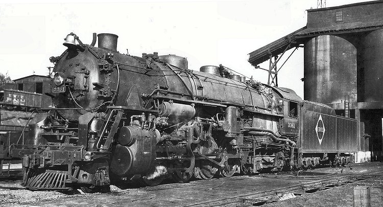 Erie Berkshire No. 3361 of class S-3 poses at the terminal in Port Jervis, New York, in 1939. The image, by an unnamed photographer, was taken from a Flickr site that was discontinued in 2008; it also appears in the Railfan.net ABPR Archive, uploaded by a user in 2003. The Erie 2-8-4s transformed the railroad into a high-speed freight line between East and Midwest. Thereafter, most 2-8-4s outshopped by American builders had 69-inch drivers, and the railroads ordering them and followed the Erie policy of using them in something other than slow drag freight service. For the dimensions of the Erie Berkshires consult the pages for Nos. 3329 and 3384.