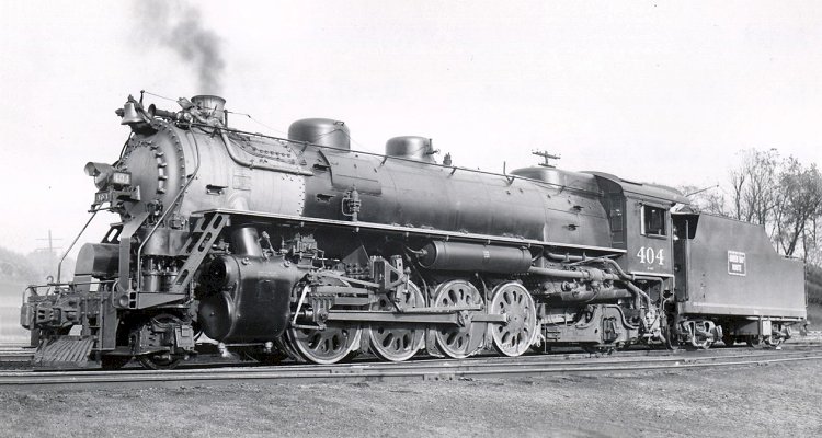 In 1939 three more ALCo "Mikes" joined the small Green Bay & Western fleet of class D-47. Their specifications were the same as for the earlier class (see No. 401 previous) except that their steam-producing capacity was augmented, with 2937 square feet of evaporative heating surface and 1184 square feet of superheating surface. They also weighed slightly less at 280,000 pounds. All the GB&W Mikados were withdrawn from service early in 1950, replaced by diesels from the same builder. This image of No. 404 at Green Bay was saved from a long-discontinued Internet site; it also appears in the Railfan.net ABPR Archive, uploaded by Bud Laws. Photographer and date are not specified.
