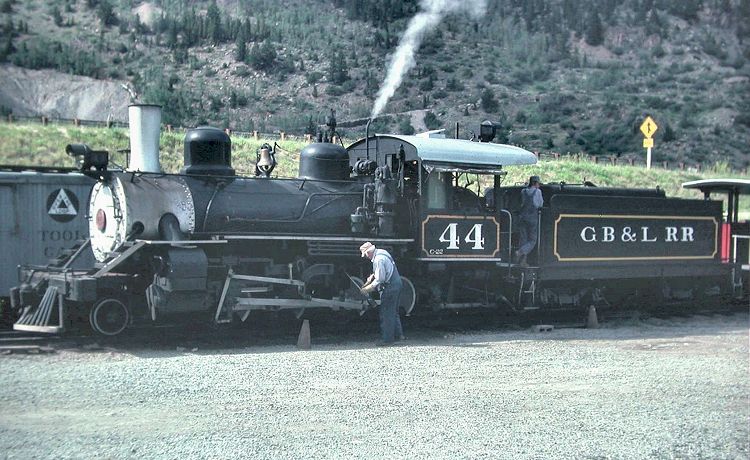 Narrow gauge (36-inch) Consolidation No. 44 gets oiled in preparation for departure from Silver Plume depot on Colorado's Georgetown Loop Railroad in August 1976. The locomotive was built by Baldwin in 1921 for the Guatemala Railway. The lettering "G B & L" stands for "Georgetown, Breckenridge & Leadville," a narrow gauge line never completed. The Georgetown Loop was not fully reconstructed at the time I took this transparency, but rides were offered part way up the line with a reverse movement back to the depot. No. 44 no longer serves this tourist operation, but is found today at the Colorado Railroad Museum in Golden.