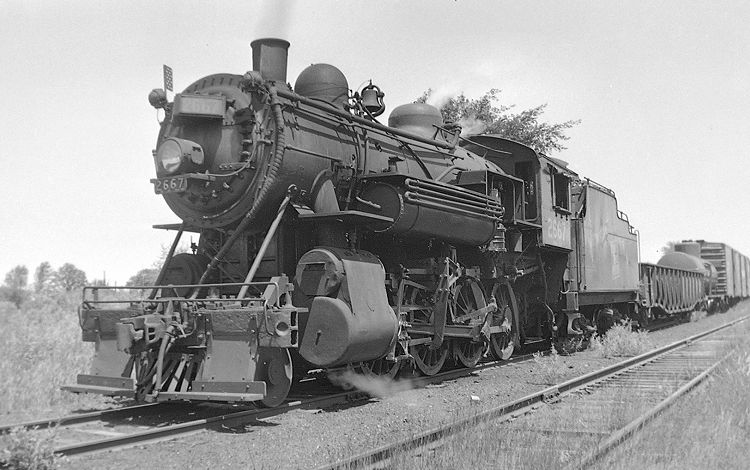 Grand Trunk Western 2-8-0 No. 2667 has halted for my camera at Middleton, Michigan, in the summer of 1953. This Consolidation belonged to class N-4-d, a group that entered service in or before 1911 for the Grand Trunk Railway with this member of the class being numbered 784. The dimensions of this class are given on the page for No. 2680. These locomotives were built by the Brooks Works of the American Locomotive Company as cross-compounds, with steam from the high-pressure cylinder on the fireman's side being reused in the low-pressure cylinder on the engineer's side. They were converted to a "simple" locomotive (both cylinders using fresh steam) around 1926, and were still in regular service in the 1950s holding down local and branch line assignments. No. 2667 was scrapped in 1955.