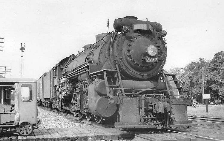 Grand Trunk Western 2-8-2 No. 3732 has halted its local freight on the eastbound main near the section house at Bellevue, Michigan. She belonged to class S-3-a, with specifications similar to those given for Nos. 3747 and 3748 but having the same weight as No. 3713. This locomotive, originally Grand Trunk No. 472, had been officially renumbered to 4068 a few months earlier to make room for diesels on the Canadian National system roster, but the numbering had not been applied when I took this photograph in August 1956; she was sold for scrap in 1960. Click the link for a view from another angle.