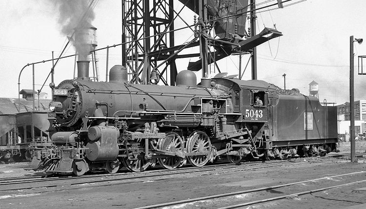 Grand Trunk Western 4-6-2 No. 5043 rests at the Milwaukee Junction terminal in Detroit on August 12, 1958 in this image captured by my brother David. These 69-inch-drivered engines of class J-3-a weighed 224,100 pounds, sustained 185 p.s.i. of boiler pressure, and had cylinders measuring 23x28 inches. With these dimensions they exerted 33,755 pounds of tractive effort. No. 5043's original Grand Trunk number was 113; she went to the scrapyard in 1961.