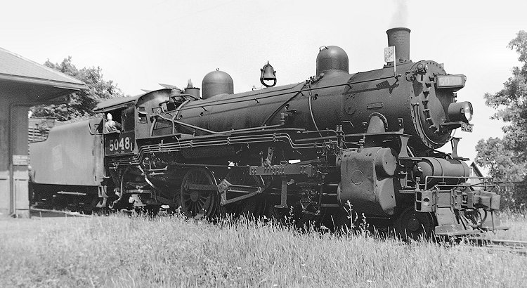 Although initially used as main line passenger power by predecessor Grand Trunk Railway, the GTW's class J-3-a Pacifics spent their later service life hauling local and branch line freight trains, an assignment in which their relatively low 69-inch drivers came in handy. When I photographed No. 5048 at Perrinton, Michigan, in July 1954, she was in charge of the daily eastbound movement on the Greenville Branch, known locally as the "Turkey Trail." These 4-6-2s alternated with class N-4-d 2-8-0s in this assignment. No. 5048's original Grand Trunk number was 118, and she met the scrapper's torch in 1960.
