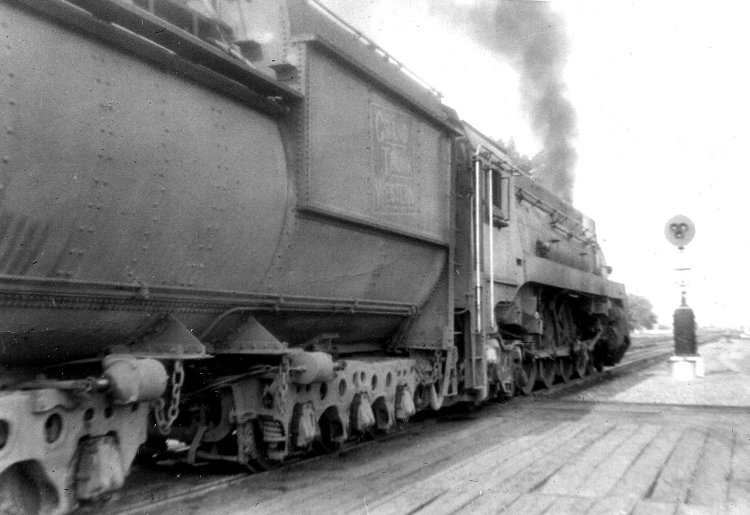 The Vanderbilt tender's cylindrical water compartment dominates this view of GTW class U-4-b 4-8-4 No. 6408, halted at Durand, Michigan, with the westbound Inter-City Limited. This image, by my brother David V. Leonard, comes from the summer of 1953.