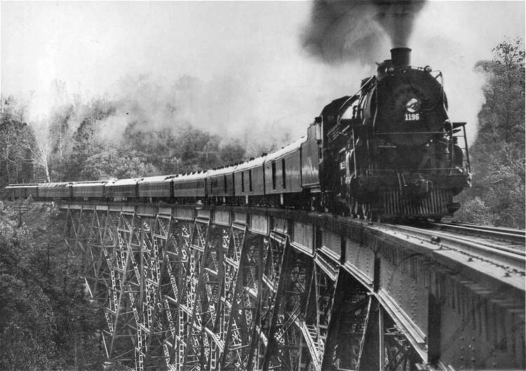 Illinois Central Pacific type No. 1196 brings its train over the High Bridge at Muldraugh, Kentucky in this view by H. N. Womack. The date of this photo, from the collection of Gary Thompson, is unknown. No. 1196 was delivered by ALCo's Schenectady Works in 1920. When rebuilt during World War II by the IC's Paducah Shops, she had her boiler pressure raised to 215 p.s.i. but retained her 26x28-inch cylinders and 75½-inch drivers, giving her a tractive force of 45,816 pounds. Her locomotive weight was also increased to 285,500 pounds. While many IC 4-6-2s were equipped with smaller driving wheels during Paducah's rebuild program and reassigned to freight service, No. 1196 kept her high-stepping configuration for the passenger service pictured above. According to Ray Breyer's all-time IC steam roster spreadsheet, No. 1196 was sold to the Paulsen Spence's Louisiana Eastern Railroad in 1958, where she became No. 6. With Spence's death and the demise of the Louisiana Eastern this engine was scrapped in 1962, and no Illinois Central Pacifics remain today.