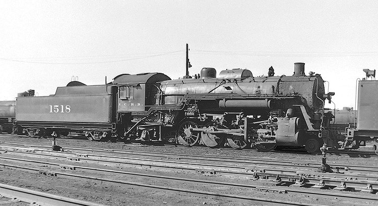 IC Mikado No. 1518 rests "dead" at the terminal in Clinton, Illinois, in May 1955. While other locomotives stored there had their valve gear disconnected and piston rod severed, and were clearly destined for the scrapyard, that was not the case for No. 1518. She was sent to Kentucky and restored to service, being photographed in August 1957 heading toward Central City, and being recorded by an IC engineer in his time book on September 6 of that year. (Careful sleuthing by Mike Favre has turned up this information.) She was chosen for preservation, and placed on display in Paducah in 1964. One source claims No. 1518 was the last Illinois Central steam engine in regular service. She had the same dimensions as No. 1362 on the previous page. No. 1518 appears in the Herron Rail video-DVD Illinois Central Steam Finale. For my photo of No. 1518 in operation at Bloomington, Illinois in September 1954, click here.