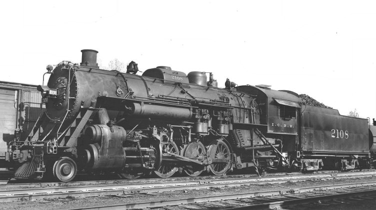 Originally 2-10-2 No. 1528, a Baldwin product of 1914, this locomotive went through the Illinois Central's Paducah Shops rebuilding program in 1938 and emerged as 2-8-2 No. 2108, reportedly also incorporating parts from a 2-8-2. R. J. Foster captured this image of the locomotive shortly after her rebuild on May 1, 1939 at East St. Louis. Dimensions of the IC's group of more than 500 rebuilt "Mikes" are comparable, but not uniform. As rebuilt, No. 2108 had 28x32-inch cylinders, a driver diameter of 64½ inches, and a boiler pressure of 225 p.s.i. Her engine weight was 336,000 pounds and her tractive effort was 74,078 pounds. No. 2108 lasted on the IC roster until 1953. The photo came to our Random Steam Collection by way of an eBay acquisition.