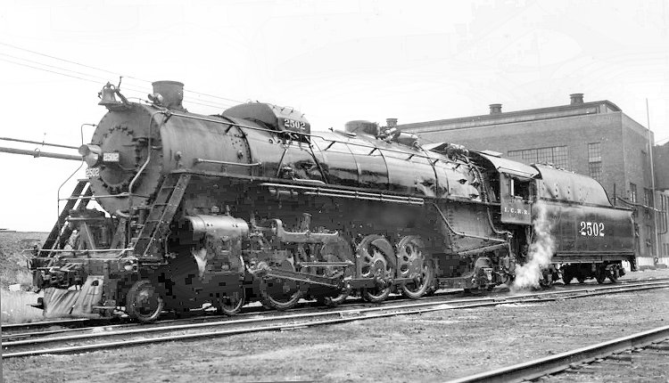 The Illinois Central's 2500-series Mountains had cylinder dimensions of 30x30 inches and 70-inch disc drivers. Some apparently sustained a boiler pressure of 225 p.s.i., and produced 73,768 pounds of tractive effort. Others had a 240-pound boiler pressure and developed a tractive effort of 78,685 pounds. The Paducah Shops rebuilt No. 2502 in 1937 from 2-10-2 No. 3006; she was scrapped late in 1959. This photo of No. 2502 appears in this collection courtesy of Tom Rock of Rock on Trains, and appears to have been taken before the 2500s were equipped with the auxiliary water tank (cistern), suggesting a date in the 1940s. The photographer is unknown, but the location is the Paducah Shops area.