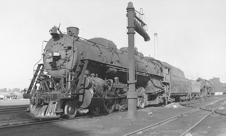 Illinois Central 4-8-2 No. 2554 rests near a water column at the roundhouse in Clinton, Illinois in October 1954. Her specifications were the same as those of the other members of the 2500-series rebuilt from 2-10-2s. Although when I took this photo steam still ruled the IC's main line from Gilman through Clinton to Springfield and the St. Louis area, it did not last much longer. No. 2554, however, evidently found work elsewhere on the IC system; according to Ray Breyer's spreadsheet she was not cut up until 1960.