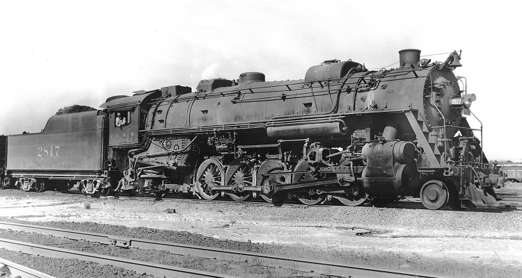 IC 2-10-2 No. 2817 appears at Bluford, Illinois on June 3, 1956 in a photo by R. J. Foster from the C. T. Felstead Collection. The former No. 2926 built in 1921 by Lima, this locomotive was one of 20 rebuilt into the 2800 series beginning in in 1943, being among the last three to emerge from the Paducah Shops in 1945. As rebuilt these engines had cylinder dimensions of 30x32 inches, 64½-inch drivers, and a boiler pressure of 275 p.s.i. They weighed 416,000 pounds and, with a hefty tractive effort of 104,322 pounds, were the most powerful engines on the IC roster. When built in 1921 they had 80 square feet of grate area, 4677 square feet of evaporative heating surface, and 1162 square feet of superheating surface. No. 2817 went to the scrapyard in 1959. The photo came to our Random Steam Collection through an eBay purchase.