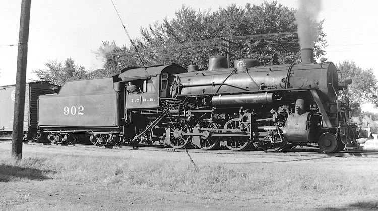 The Illinois Central's 900-series Consolidations were products of Baldwin Locomotive Works; No. 902 was erected in 1911 as No. 966 and was renumbered during a 1943 rebuilding, during which the group received stokers. As rebuilt No. 902 had 22½x30-inch cylinders, 62-inch drivers and 235 p.s.i. of boiler pressure; she produced 48,930 pounds of tractive effort and weighed 244,000 pounds. When my family moved to Bloomington, Illinois, in 1954 these 2-8-0s were the regular power on the line between Bloomington and Kankakee, and I photographed No. 902 in September of that year. This engine was filmed in Kankakee by John Szwajkart, and is seen in the Mark I video The Midland and Two Centrals; she also appears briefly in the Herron Rail video-DVD Illinois Central Steam Finale. She met the torch in 1955.