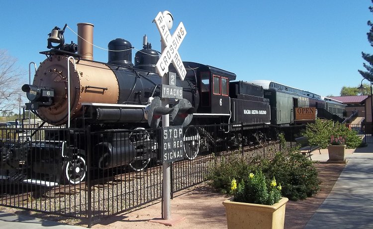 Displayed at the McCormick-Stillman Railroad Park in Scottsdale, Arizona, is former Magma Arizona 2-6-0 No. 6. This Mogul type was built in 1907 by Burnham, Williams & Company, a division of Baldwin Locomotive Works, for the Arizona & New Mexico Railway. The engine was sold to the Magma Arizona Railroad in 1922 or 1923 when that line was converted from narrow to standard gauge, and ran there until retirement in 1961. (Another source states that in 1922 the locomotive was leased to the El Paso & Southwestern, a part of the Southern Pacific system, as its No. 130.) Subsequently No. 6 became the property of the Scottsdale Railway & Mechanical Society. No details are available concerning the locomotive's specifications. The copper-colored smokebox was a distinctive feature of Magma Arizona steam locomotives during their operating years. My sister, Lucy L. Hill, captured this image during a visit to Scottsdale in February 2014.