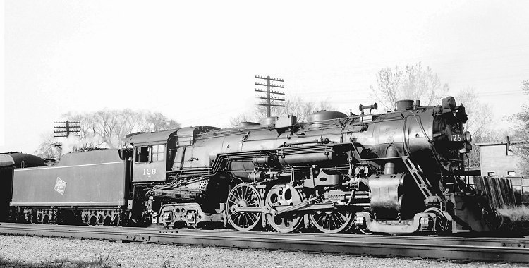 The Milwaukee's 4-6-4s are sometimes referred to as "Baltics," a name given to 4-6-4T tank engines in Europe. No. 126 appears here at Deerfield, Illinois on May 1, 1954, a few years after the previous image. The photo, by Bruce Black, comes from the collection of Carl Weber. This locomotive originally bore the number 6401, and was retired at the end of 1954. For specifications of the Milwaukee Road 4-6-4s, view the pages for Nos. 128 and 135 following.