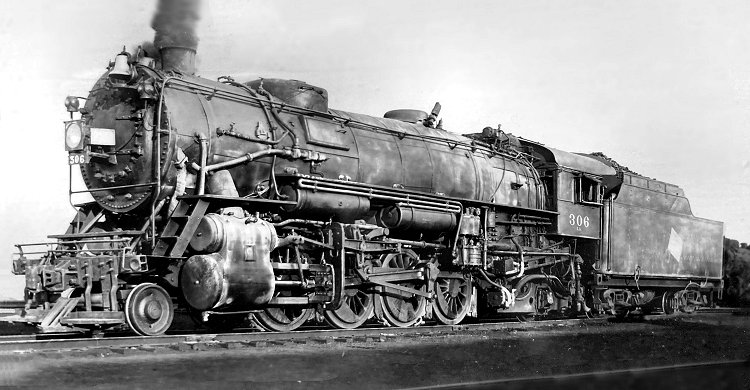 Mainstays of the Milwaukee Road's freight service prior to the introduction of the 4-8-4s were the 100 locomotives of class L3, 2-8-2s of the heavy USRA design. No. 306, seen here at Bensenville, Illinois in February 1942, came from the American Locomotive Company's Brooks works in 1918 as No. 8620. With 63-inch drivers, she had 27x32-inch cylinders and produced 190 p.s.i. of boiler pressure. Locomotive weight was 320,000 pounds and tractive force 59,801 pounds. No. 306, reclassified as L3-a, was equipped with a booster which raised the tractive effort to 62,949 pounds. The L3 class had a grate area of nearly 49 square feet, with 2950 square feet of evaporative heating surface and 720 square feet of superheater surface. This view of No. 306 comes from the collection of Clifford "Mike" Southard, as preserved at the Kishwaukee Valley Heritage Museum in Genoa, Illinois. She was stricken from the roster in 1953.