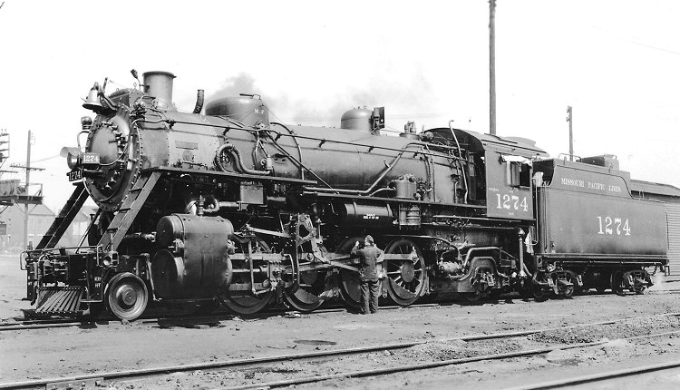 Gleaning data about members of the Missouri Pacific's MK-63 class of Mikados can be confusing. The 1251 subclass of the MK-63 group came from Baldwin Locomotive Works in 1913-1914 as Nos. 1251-1280. Over the years, however, the railroad rebuilt these 63-inch-drivered engines changing their specifications and appliances so that the various examples differed one from another. In rebuilding, the Sedalia Shops converted many of the 1251 subclass from coal to oil, including No. 1274 shown here, and replaced the original fabricated trailing truck with a Delta trailing truck that incorporated a booster raising the engine's total tractive effort to 65,190 pounds. Cylinder dimensions were reduced from 27x30 to 26x30 inches, and boiler pressure was raised from 170 to 200 p.s.i. Sources indicate that No. 1274 was not given the Worthington feedwater heater the others in the oil-burning group received, but from the box-like projection behind the bell in this photo it does appear to have the Worthington type. Heating capacity specifications for the oil-burning group are given as 56½ square feet for grate area, 3521 square feet for evaporative heating surface, and 770 square feet for superheating surface. Members of the 1251 subclass remaining on the MoPac roster were retired between 1949 and 1955. No. 1274, looking fresh out of the shops, appears at St. Louis in a 1935 photo by R. J. Foster from the Roy F. Blackburn collection, acquired from an eBay seller.
