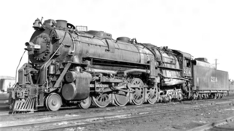 This image of Missouri Pacific 4-8-4 No. 2114 came from Frank Fabian via the good offices of Wayne Koch, but with no information about the photo's date or location or the photographer actually responsible. No. 2114 belonged to the "Victory" group of MoP Northerns rebuilt from Berkshires, this example having been No. 1914. Locomotive weight was 445,950 pounds and tractive effort was 66,640 pounds. Their evaporative heating surface totaled 4839 square feet, their superheating surface 1938 square feet, and their grate area slightly more than 88 square feet. Other specifications for the N-75 class are as given for No. 2102 on the previous page.