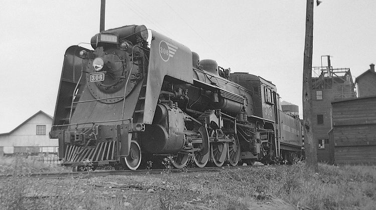 Passing through North Bay, Ontario in August, 1955, I was able to photograph 2-8-2 No. 306 at the ONR terminal facilities, stored "dead" but still with valve gear rods attached. No. 306 was built in 1921 by the Canadian Locomotive Company for the Temiskaming & Northern Ontario, the name of the Ontario Northland before 1946. (It is said the name was changed to avoid confusion of its initials with the Texas & New Orleans, a Southern Pacific subsidiary in the U.S.) This locomotive was originally a member of the 141 class as No. 147, then was renumbered in 1929 to No. 306 in the 300 class. These engines had 63-inch drivers and 25x30-inch cylinders. They carried a boiler pressure of 180 p.s.i. and weighed 238,000 pounds. With these dimensions, their tractive effort was about 49,500 pounds. All ONR 2-8-2s were scrapped by 1957 when the railroad became completely dieselized.