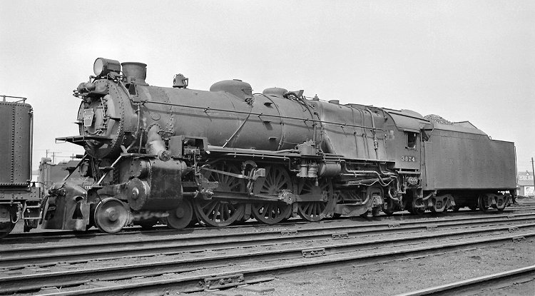 Pennsylvania Railroad 4-6-2 No. 3674, shown here at Atlantic City, New Jersey on August 28, 1954, represents the K4s class in its final years of service. A 1918 graduate of the Juniata Shops, No. 3674 displays the modernization package described in the commentary on No. 518. (For the classic K4 front, see the photo of No. 5499.) The image, photographer unknown, appears here courtesy of Carl Weber.