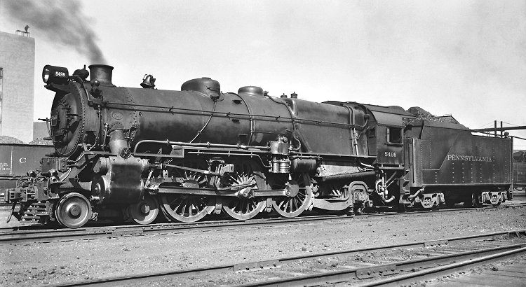 Pennsylvania Railroad 4-6-2 No. 5499 was the newest of the 424 members of the K4s class, coming out of the Altoona shops in 1928. Ironically, she is shown in our Random Steam Collection to represent the general appearance of the K4 before visible modernization or application of experimental features. The headlight and generator are in their original position, and the slatted pilot has yet to be replaced with the solid sheet steel pilot eventually applied to many members of the class. An unidentified photographer snapped the photo at East St. Louis on May 11, 1938; it came to our collection via Carl Weber.