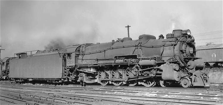 Until the advent of the less than totally successful Q2 duplex drive freight engines in the mid-1940s, fast freight and general merchandise duties on the Pennsylvania Railroad typically fell to the 301 M1 and M1a Mountain types. These 4-8-2s often handled heavy passenger or mail trains as well. No. 6747, shown here in an unattributed photo, belonged to the M1a group, being a 1930 product of Baldwin Locomotive Works, the PRR's favored builder outside of its own Juniata Shops. These locomotives had 72-inch drivers and 27x30-inch cylinders, and carried 250 p.s.i. of boiler pressure. They developed 64,550 pounds of tractive effort and weighed 390,000 pounds; for other specifications consult the commentary for No. 6919 following. No. 6747's 12-wheel tender has the head breakman's shanty atop the water compartment, a feature common in Pennsylvania Railroad practice.