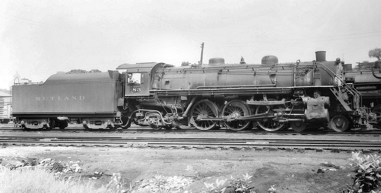 The Rutland's finest passenger power, until the arrival of the 4-8-2s in 1946, were the three class K-2 Pacifics that American Locomotive Company delivered in 1929. They featured modern appliances such as a front-end throttle, pilot-mounted air pumps, and a one-piece cast trailing truck. They had 25x28-inch cylinders, carried 215 p.s.i of boiler pressure, and rolled on 73-inch drivers. Their grate area totaled 67 square feet, their evaporative heating surface 3994 square feet, and their superheating surface 1808 square feet. Weighing 292,500 pounds, they developed a tractive effort of 43,800 pounds. Retirement for these well-proportioned engines was complete by 1953. Carl Weber provided this undated photo of No. 83, first of the class, likely taken at Rutland by a photographer whose name has not come down to us.