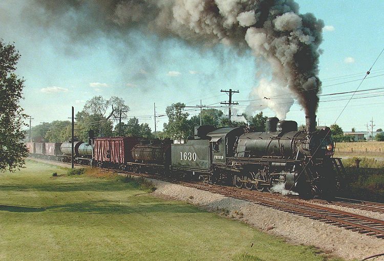 Frisco 2-10-0 1630 approaches Spaulding Tower with its vintage train, in a photo runby at the Illinois Railway Museum on September 23, 1990.