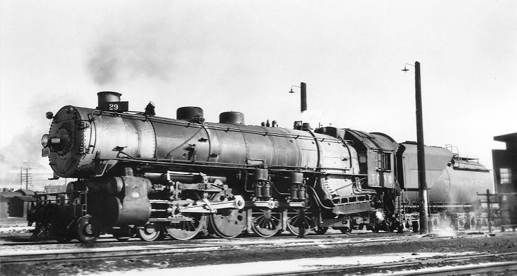 The Union Pacific's first group of class 4-8-2s came from the American Locomotive Company's Brooks Works in 1922 with the Young valve gear, as shown here on No. 7038 in a photo purchased from an eBay seller, location and photographer unspecified. These class MT-1 4-8-2s were the only UP engines to feature this type of valve gear, promoted by the Pyle-National Corporation. In the mid-1930s their valve gears were changed to the Walschaerts configuration, dating this image probably to that time, and they were given one-piece cast-steel frames. Before the advent of the 4-8-4s in 1937 they were the UP's premier passenger power, one (No. 7002) even being streamlined. Members of the MT-1 class rolled on 73-inch drivers; they sustained 200 p.s.i. of boiler pressure and had cylinder dimensions of 29x28 inches. With a grate area of 84 square feet, they had 4974 square feet of evaporative heating surface and 1241 square feet of superheating surface. They weighed 350,250 pounds and developed a tractive effort of 54,838 pounds.