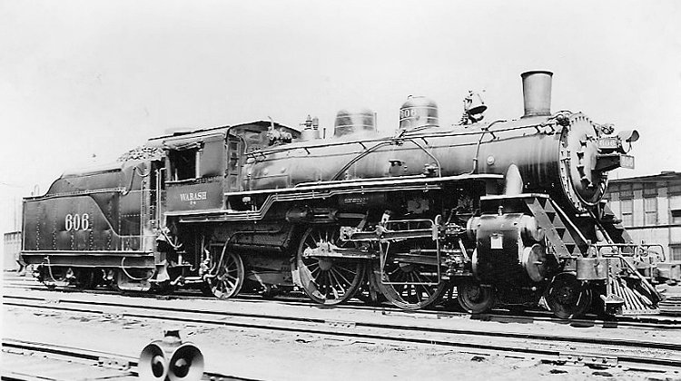 The Wabash's high-stepping Atlantic types of class E-4 featured 80-inch-diameter drivers. They had 21x28-inch cylinders and 210 p.s.i. of boiler pressure, and exerted 27,551 pounds of tractive force. Their modest proportions gave them only 45 square feet of grate area. Although originally unsuperheated, a rebuilding gave them 2365 square feet of evaporative heating surface and 510 square feet of superheater surface. In this view scanned from a print in the collection of Wayne Koch, No. 606 poses at an unidentified location probably during the early 1930s. The photographer's identity is also unknown.